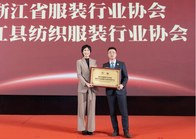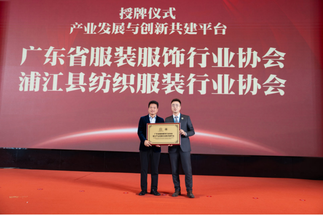 广东省服装服饰行业协会副会长/秘书长何志康与浙江省服装行业协会执行秘书长赵悦先后上台,分别向浦江县纺织服装行业协会授牌,标志着浦江纺织服装产业正式融入更广阔的省级行业协作网络,开启了跨区域资源联动与创新共建的新篇章。